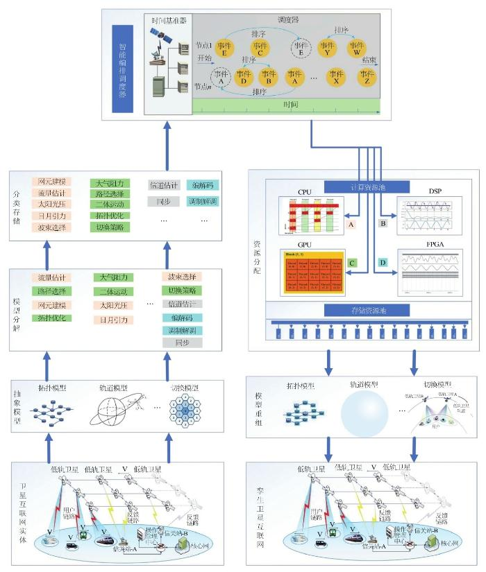 以移动性管理中的切换问题为例,智能编排调度首先需要基于拓扑模型、轨道模型和切换模型等的子模型,对CPU、GPU、DSP和FPGA等算力类型的需求进行分析,并对模型进行子模型分解。同时,需要对算力需求类型进行标识。其次,为了便于编排器快速调度,应将标识后的子模型进行分类存储。然后,基于分布式的编排调度器在时间基准器(例如铷钟、北斗系统)的驱动下,将子模型以事件形式按时空顺序分配到计算资源池的不同处理器中进行处理。例如,将波束选择分配给CPU处理,将大气阻力子模型分配给GPU进行运算加速,将调制解调分配给DSP完成,将编解码分配给FPGA加速。同时,需要为子模型正确调度存储资源池中的数据或者其他子模型处理后的数据以完成建模。最后,将各个子模型得到的结果通过模型重组与映射实现卫星互联网的孪生重建。