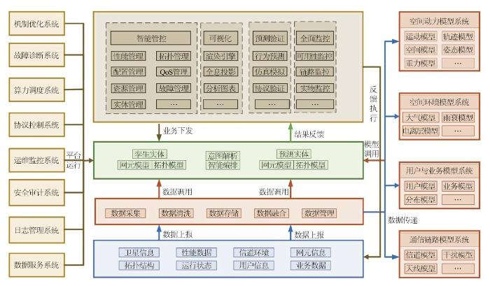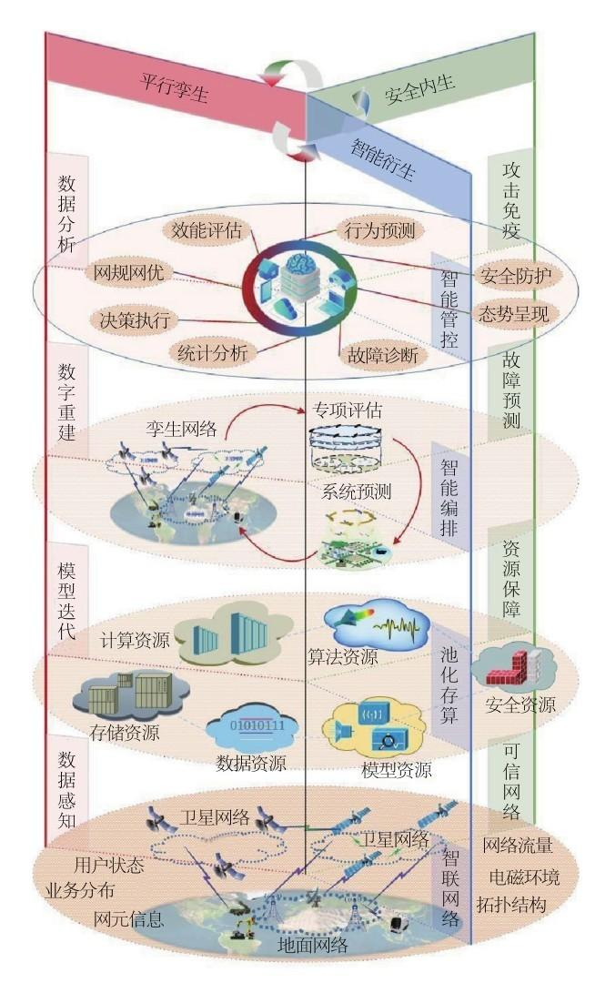 实体层由实际网络系统和物理环境共同构成,涵盖节点设备、网络运行状态、监控与管制机制,以及物理数据的感知反馈。具体而言,该层包括网元设备的运行状态信息、用户行为特征、网络流量特征、业务分布情况、路由拓扑结构、电磁环境参数、卫星姿态信息等。实体层不仅需要建立向上级的反馈机制和向下级的执行体系,以确保用户获得全域全时的智能可信网络服务,还需构建数据采集与回传的全面感知网络,以实现对网络运行状态的全方位监督与管理。