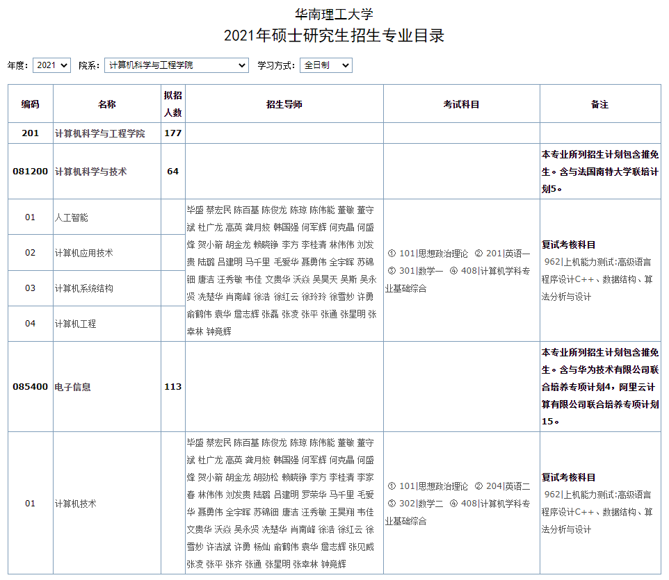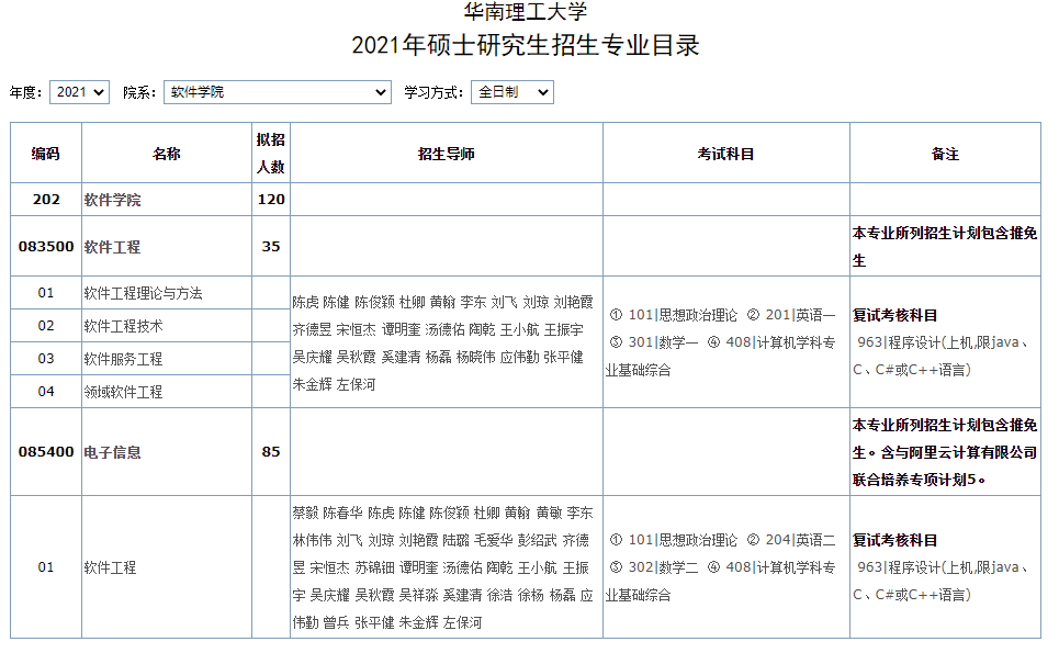 可以看到,华南理工大学主要有计算机学院和软件学院招收计算机有关的研究生。计算机学院有计算机专硕,软件学院有软件专硕,都属于电子信息专业。而且考试科目都是数学二英语二408。