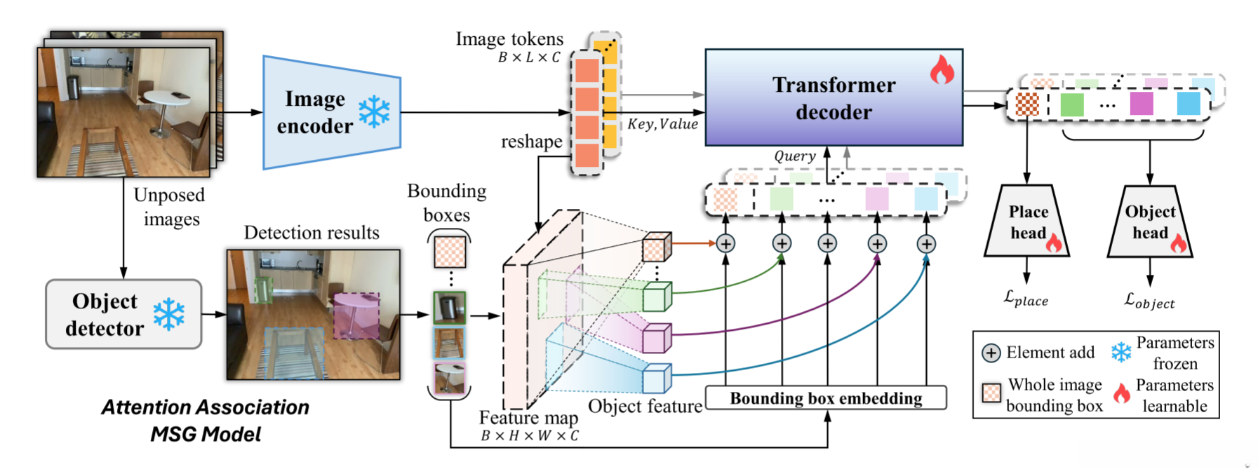 地点和对象编码 给定一批未定位的 RGB 图像作为输入,AoMSG 模型首先使用预训练的编码器和检测器来从每幅图像中生成图像标记和对象检测边界框。我们使用基于 Vision Transformer 的预训练模型 DINOv2 作为我们的编码器,尽管我们的设计适用于任何基于 Transformer 或基于 CNN 的编码器,这些编码器会生成一系列标记或特征图。在 DINOv2 编码器的情况下,我们将输出的标记序列重塑为特征图,该特征图与对齐的边界框对齐,为每个检测到的对象聚合一个编码特征。为了在统一框架内整合地点识别和对象关联,我们通过将其视为一个包含整个图像的大边界框来获取地点编码特征,将特征聚合为检测到的对象。所获得的地点特征随后与对象特征一起排列,作为 Transformer 解码器的查询,如后续部分所述。