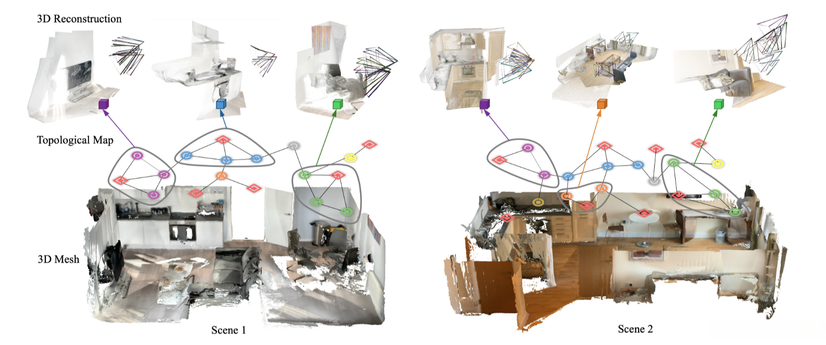 作为一个展示应用,我们使用最新的现成3D重建模型Dust3r提供了图6所示的两个局部3D重建案例。直接将Dust3r应用于密集图像集会极大地消耗GPU内存,这对移动机器人来说可能是不可行的。然而,随机子采样无法保证重建质量。相反,借助多视图场景图(MSG),我们可以为Dust3r提供局部互联子图,以实现快速且可靠的局部重建。由于MSG具有地点加对象的特性,这些子图和局部重建可以以对象为中心。此外,局部重建通过MSG在拓扑结构上相互连接。这表明MSG能够提供一种平衡2D和3D、抽象与细节的灵活场景表示。
