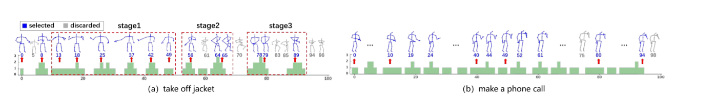 在本研究中,我们开发了一种分阶段强化学习模型(DPRL)用于基于骨架的视频动作识别任务。该目标旨在通过筛选最具代表性的关键帧来提取动作特征并排除不确定性较高的帧信息。鉴于每个视频样本中含有大量候选关键帧供选择,在本研究中我们将这一过程建模为一个渐进式的优化问题,在这一过程中我们需要综合考虑两个关键因素:(1)所选关键帧的质量评估;(2)所选关键帧与其在整个视频序列中的关联性分析。此外,在分析人体骨骼时(即顶点与边分别表示人体骨骼中的关节连接关系),我们采用了图卷积神经网络架构以捕捉关节间的相互关系从而实现精准的动作识别。实验结果表明我们的方法在三项标准测试中展现了强大的性能表现