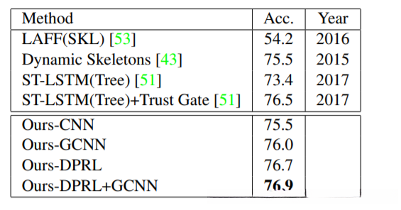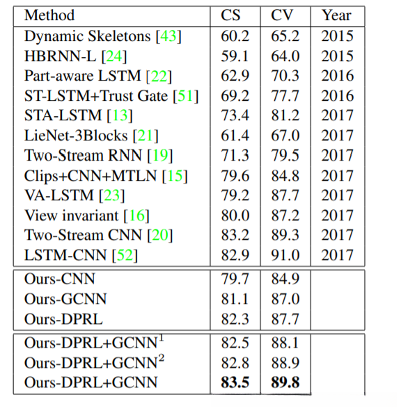 GCNN分析:基于图的表示学习挖掘身体关节之间的依赖关系。表1中的实验结果表明,基于图形的模块提高了性能。在实验中,我们尝试了不同的参数,将它们作为不同的权重分配给内在依赖关系和外在依赖关系。在表中,GCNN1忽略了外部依赖关系GCNN2同样重视这两种依赖关系,GCNN在强调内在依赖的同时保留了外在依赖关系。结果表明,GCNN性能最好,GCNN2优于GCNN1。结果表明,两种依赖关系对行为识别都有贡献,其中内在依赖关系更为重要。然而,通过仔细和动态地调整分配的权重,仍有进一步改进的空间SYSU-3D数据集的结果我们将我们的方法与最先进的基于骨架的动作识别方法进行了比较,如表2所示。正如所看到的,我们提出的方法在这个数据集上优于所有其他最新的方法。我们还发现,本文提出的DPRL方法可以将基线分类准确率提高1.2%,而结合基于图的表示学习模型可以使基线分类准确率再提高0.2%。这说明了在两个模块中选择关键帧和学习空间依赖性的有效性。