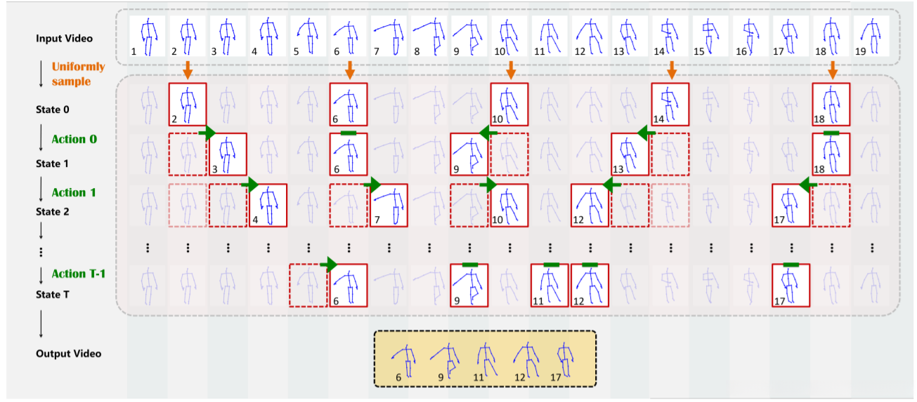 图3展示了基于骨骼结构的关键帧选择流程,在一个骨架序列中依次筛选出关键帧。通过不断优化采样策略,在视频中提取出信息含量最高的几个片段作为代表样本。每个状态记录所选帧的具体信息、其索引位置以及整个序列的时间轴数据。根据当前状态及FDNet模型推断出每一轮选中的帧随后将向左、保持不变或向右移动的方向趋势