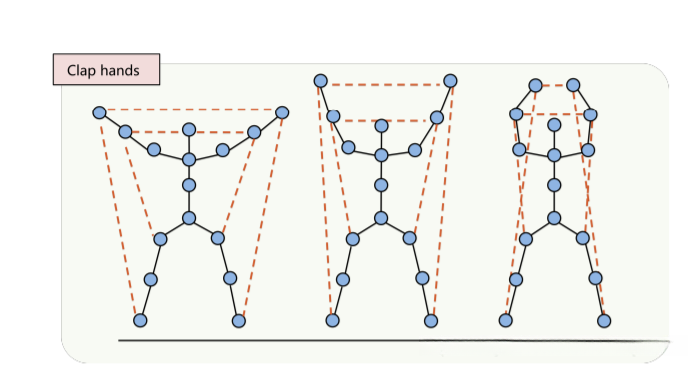 图2所示的线条代表关节间的物理连接;它们具有重要意义,并且各连接关节间的相对距离在整个动作过程中始终保持恒定。外部依赖关系(如图2中标注的橙色虚线所示),即两部分之间断开的状态,则是判断动作类型的重要依据之一。例如,在实际操作中我们可以观察到,并非所有情况下左右手都是直接相连的;相反地,在某些特定场景下它们的表现会呈现出显著差异性特征。在此基础上我们采用W中的参数来建模这种外部依赖关系:通过这种方式能够更准确地反映人体运动学特征并辅助后续的动作分类任务完成