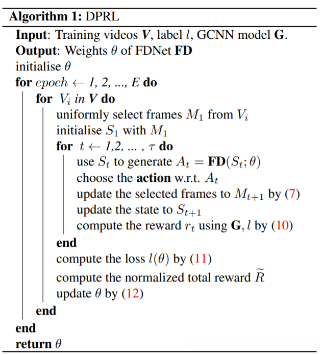 在算法1中概述了我们提出的DPRL流水线的设计方案。深度强化学习(DRL)问题通常可分为两种主要类型:深度Q-学习(Deep Q-Learning)和策略梯度方法(Policy Gradient)。如前所述, 我们的动作空间由对m个关键帧进行不同选择构成。每个被选中的帧提供三种不同的动作选项, 其组合数量呈指数级增长至3^m种可能性。由于深度Q-学习计算复杂度过高, 为此我们采用了一种策略梯度方法, 其输出维度随状态空间线性增长而不会爆炸式膨胀。