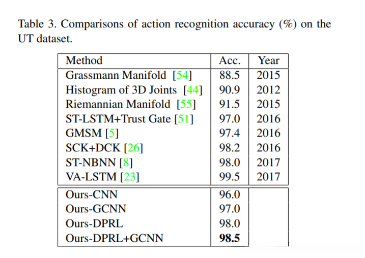 在UT数据集上进行实验对比的结果表3展示了UTI-Kinect数据集与其他现有先进方法之间的性能差异。通过实验结果可以看出,在改进型深度关系学习(DPRL)模型以及基于图的模型之间存在显著性能差距。值得注意的是,在现有的研究中并未完全超越VA-LSTM这一领先技术的具体原因在于该算法特别关注不同视图间的特征匹配问题,在实际应用中这种情况较为普遍。相比之下,在GMSM算法的基础上提升了约1.1%其中也采用了另一种图形模型