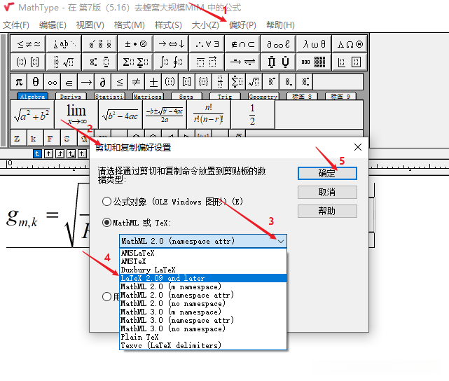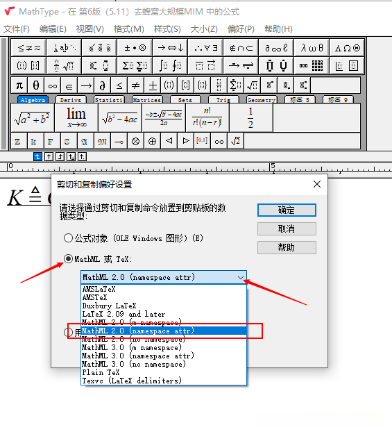 选择MathML或Tex ---> MathML 2.0 (namespace attr) ---> 确定
