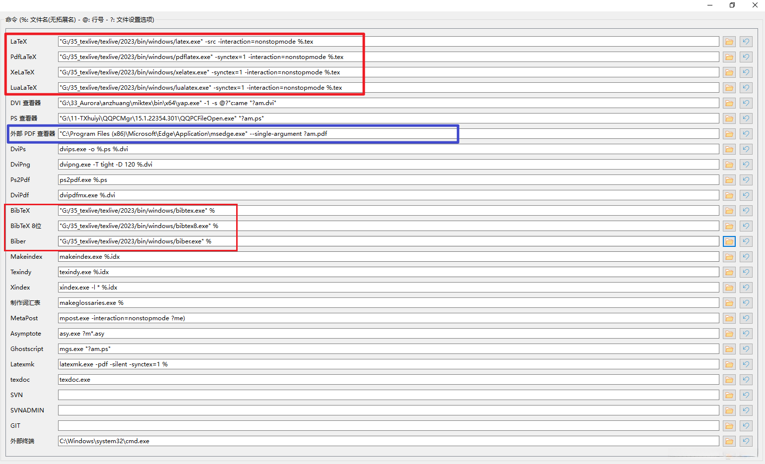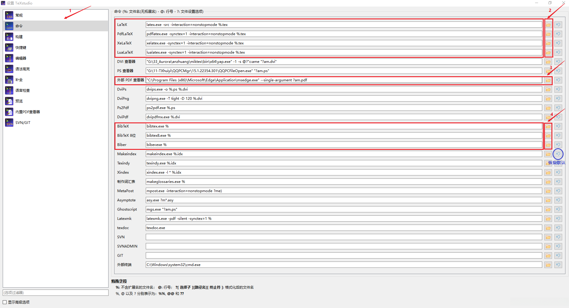 选择左侧命令设置不同编译器,外部PDF查看器,和参看文献的执行程序: 点击命令1 ----> 将2、3、4的路径设置为TeXlive安装路径下对应的EXE文件(点击“篮圈”可以恢复默认设置)