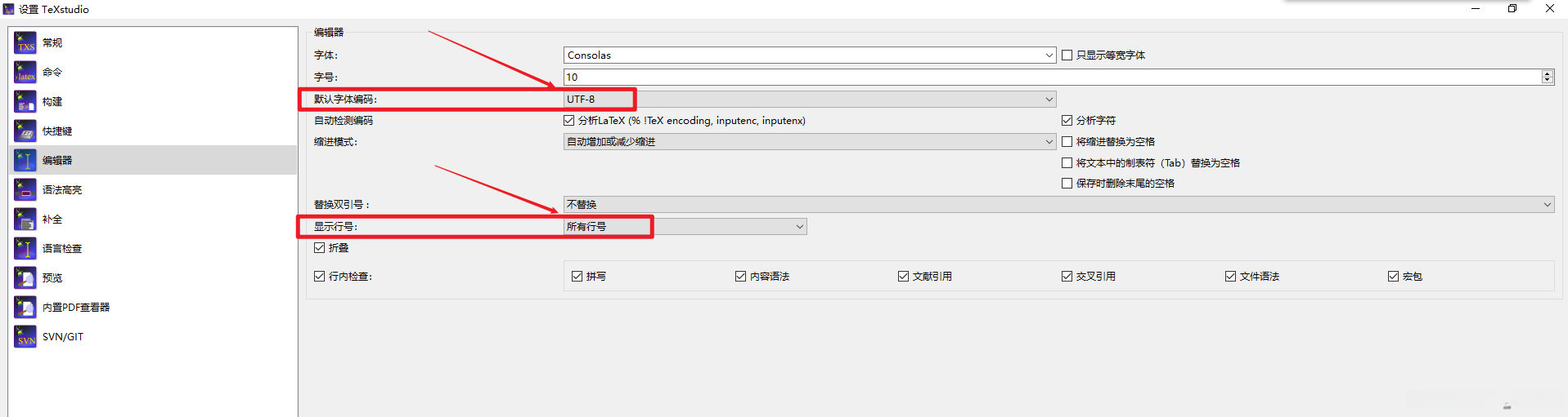 设置默认字体编码和添加行号: 点击编辑器 ----> 默认字体编码为UTF-8(一般不修改)---> 显示行号:所有行号。(这是因为添加行号,可以快速定位某个词或句的位置。此外,当程序报错时,可快速定位到出错位置,方便修改。)