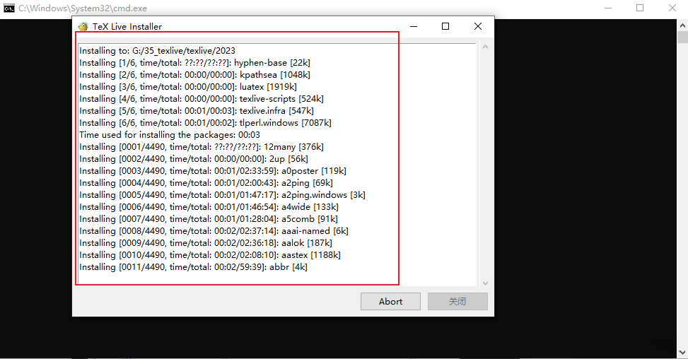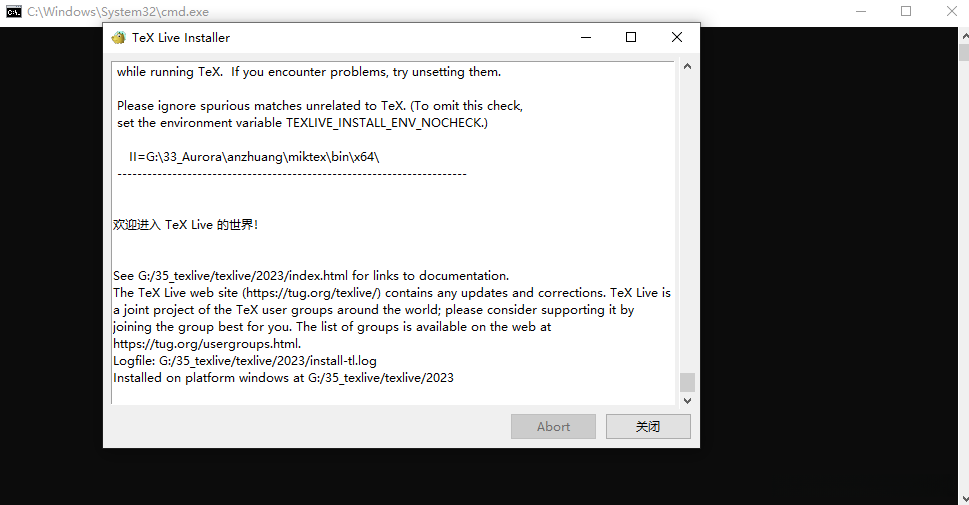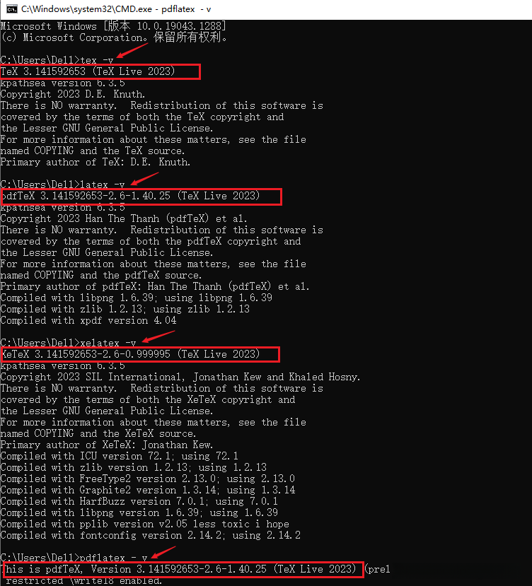 分别输入tex -v, latex -v, xelatex -v, pdflatex - v 出现版本号证明安装成功!!!