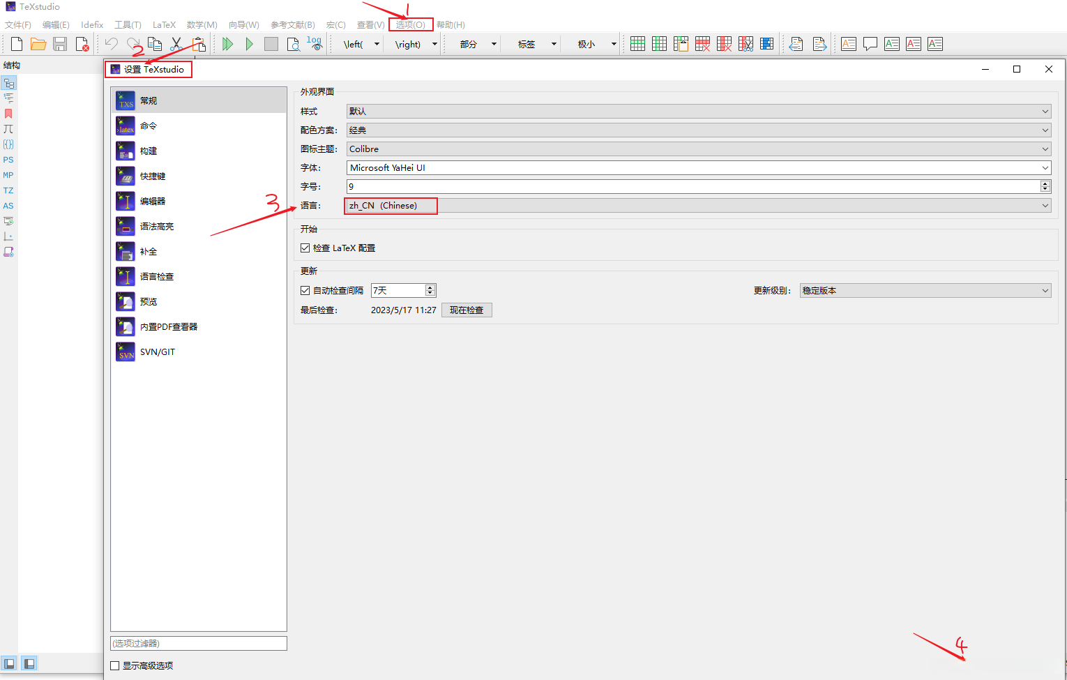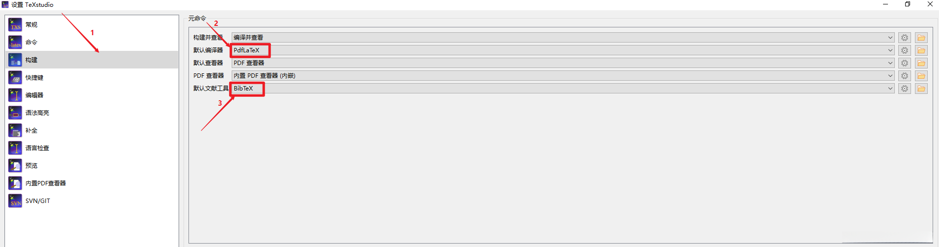 修改默认编译器、默认PDF查看器、默认文献工具等设置: 点击构建 ----> 若写中文论文,则需修改默认编译器为XelaTeX.;若为英文,则用PdfLaTex。----> 确认