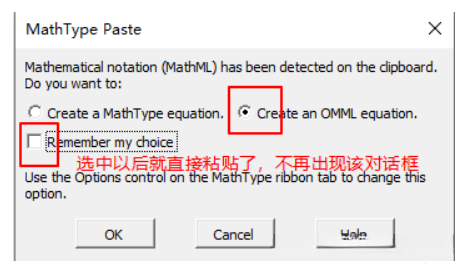 Ctrl+V ---> Create an OMML equation ---> Remember my choice ---> OK