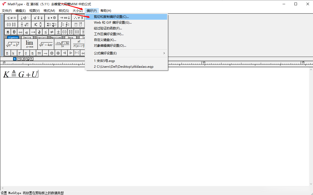 双击文中的内嵌的公式 ---> 打开Mathtype的编辑窗口 ---> 偏好 ---> 剪切和复制偏好设置(C)..