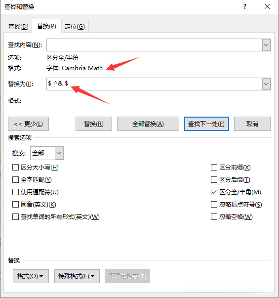 Word中,替换 ---> 查找内容 ---> 格式 ---> 字体 ---> Cambria Math ---> 替换为 ---> ^&