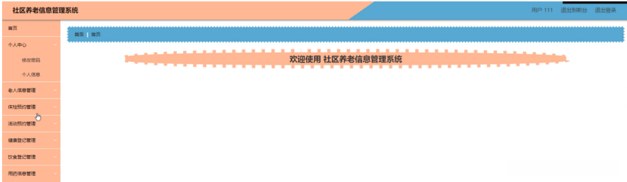 用户登录系统后,可以对首页,个人中心,老人信息管理,体检预约管理,活动预约管理,健康登记管理,饮食登记管理,用药信息管理等进行相应的操作管理,如图5-22所示。
