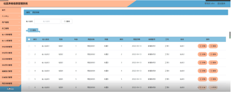 用药信息管理,在用药信息管理页面可以查看索引,老人姓名,性别,年龄,用药名称,剂量,频次,用药日期,家属账号,工号,姓名等内容并进行详情和删除操作,如图5-18所示。
