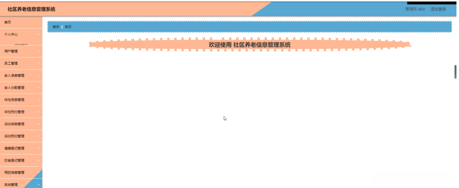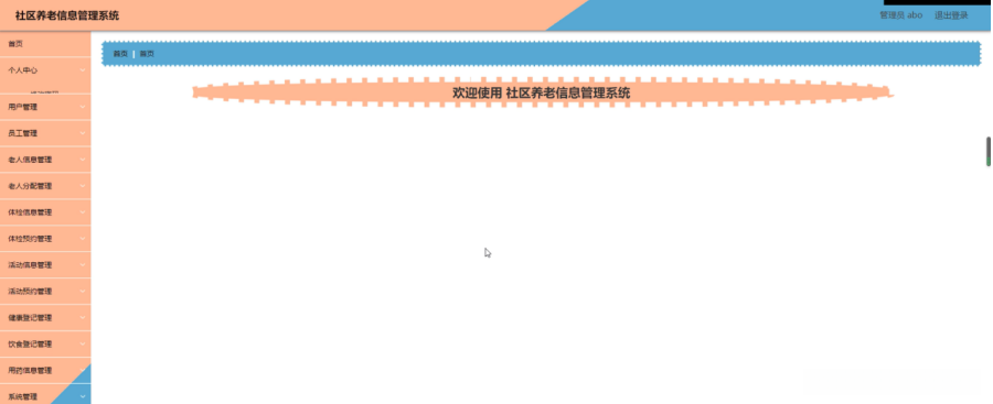 管理员登录系统后,可以对首页,个人中心,用户管理,员工管理,老人信息管理,老人分配管理,体检信息管理,体检预约管理,活动信息管理,活动预约管理,健康登记管理,饮食登记管理,用药信息管理,系统管理等进行相应的操作管理,如图5-7所示。