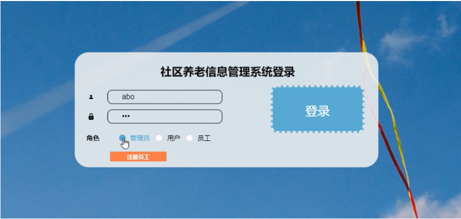 管理员进行登录,进入系统前在登录页面根据要求填写用户名和密码,选择角色等信息,点击登录进行登录操作,如图5-6所示。