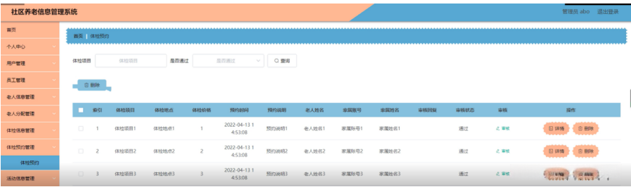 体检预约管理,在体检预约管理页面可以对索引,体检醒目,体检地点,体检价格,预约时间,预约说明,老人姓名,家属账号,家属姓名,审核回复,审核状态,审核等内容进行详情和删除等操作,如图5-13所示。