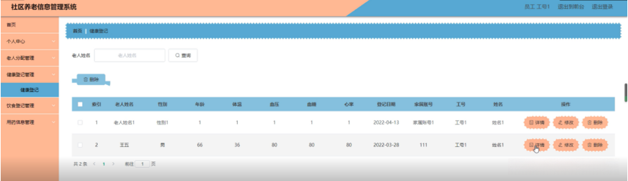 健康登记管理,在健康登记管理页面可以查看索引,老人姓名,性别,年龄,体温,血压,血糖,心率,登记日期,家属账号,工号,姓名等内容并进行详情,修改和删除操作,如图5-21所示。
