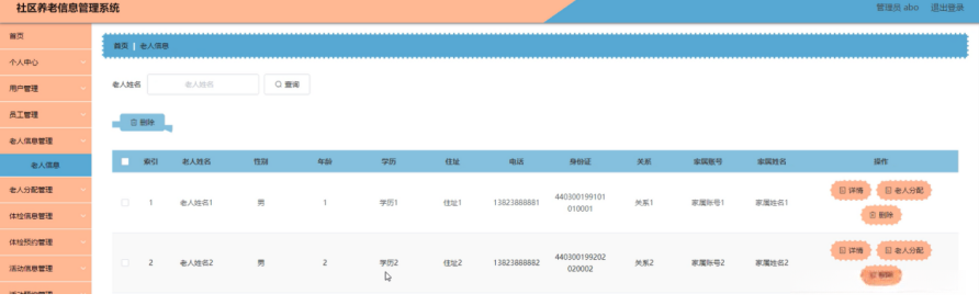 老人信息管理,在老人信息管理页面可以对索引,老人姓名,性别,年龄,学历,住址,电话,身份证,关系,家属账号,家属姓名等内容进行详情,老人分配和删除等操作,如图5-10所示。