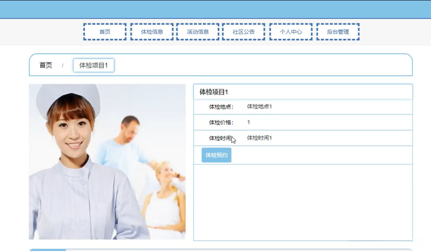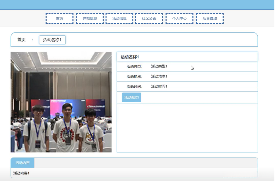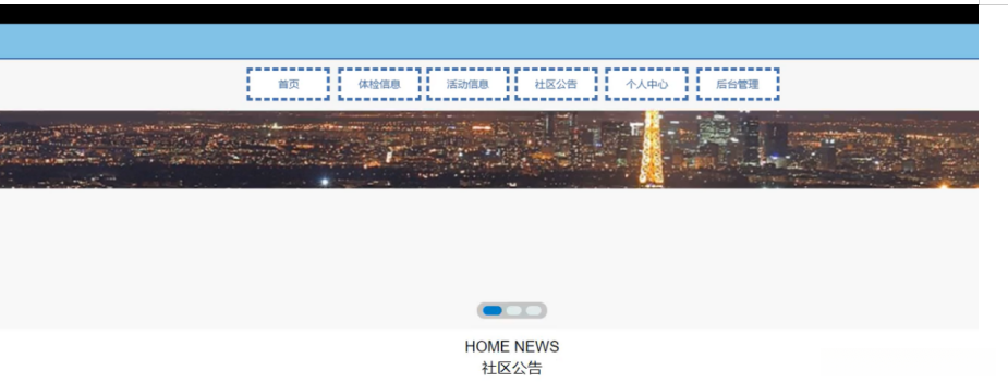 社区养老信息管理系统,在系统首页可以查看首页,体检信息,活动信息,社区公告,个人中心,后台管理等内容,并进行详细操作,如图5-1所示。