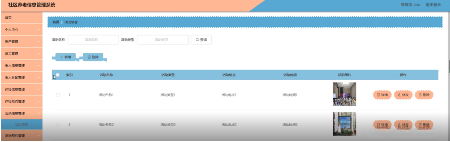 活动信息管理,在活动信息管理页面可以对索引,活动名称,活动类型,活动地点,活动时间,活动图片等内容进行详情,修改和删除等操作,如图5-14所示。