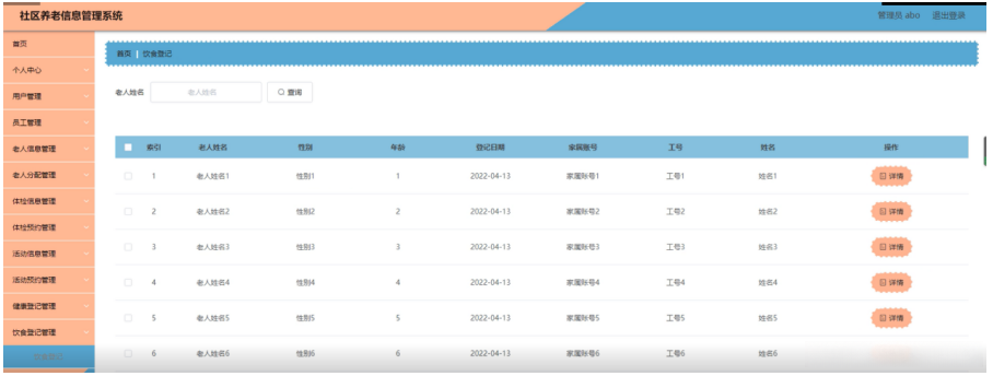 饮食登记管理,在饮食登记管理页面可以对索引,老人姓名,性别,年龄,登记日期,家属账号,工号,姓名等内容进行详情操作,如图5-17所示。