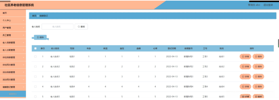 健康登记管理,在健康登记管理页面可以查看索引,老人姓名,性别,年龄,体温,血压,血糖,心率,登记日期,家属账号,工号,姓名等内容并进行详情和删除操作,如图5-16所示。