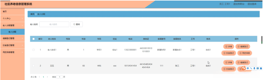 老人分配管理,在老人分配管理页面可以对索引,老人姓名,性别,年龄,学历,住址,电话,身份证,家属账号,家属姓名,工号,姓名等内容进行详情,健康登记,饮食登记和用药信息等操作,如图5-20所示。