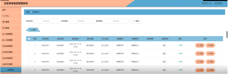 活动预约管理,在活动预约管理页面可以对索引,活动名称,活动类型,报名时间,报名说明,老人姓名,家属账号,家属姓名,审核回复,审核状态,审核等内容进行详情和删除等操作,如图5-15所示。