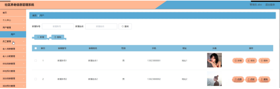 用户管理,在用户管理页面可以对索引,家属账号,家属姓名,性别,手机,地址,头像等内容进行详情,修改和删除等操作,如图5-8所示。
