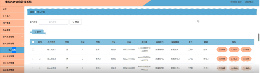 老人分配管理,在老人分配管理页面可以对索引,老人姓名,性别,年龄,学历,住址,电话,身份证,家属账号,家属姓名,工号,姓名等内容进行详情,修改和删除等操作,如图5-11所示。