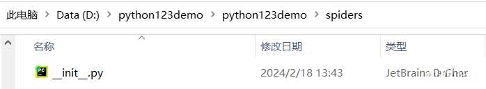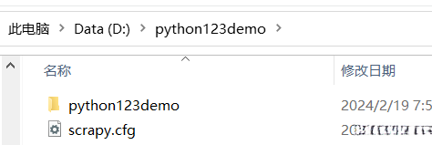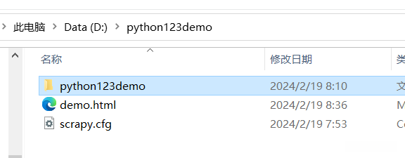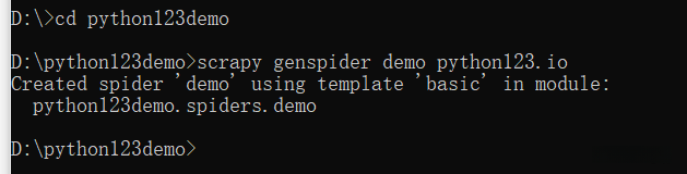 3.进入工程,在工程中产生一个scrapy爬虫,命令为scrapy genspider demo python123.io,这条命令的作用是生成一个名称为demo的spider。