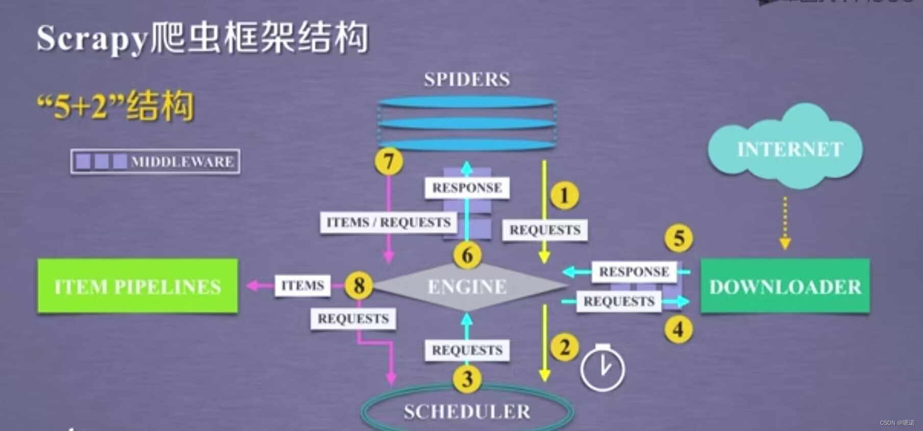第一条路径(1、2)从spiders到engine的地方获得了爬取用户的请求request,scheduler负责对爬取请求进行调度