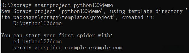2、输入scrapy startproject python123demo,用以创建一个名字为 python123demo的工程。