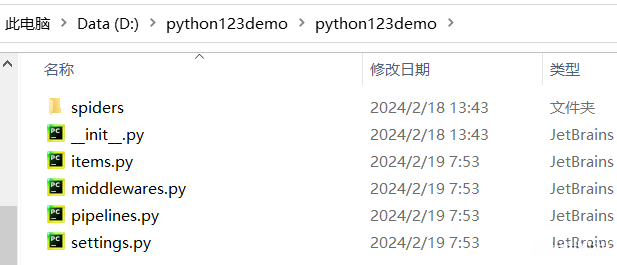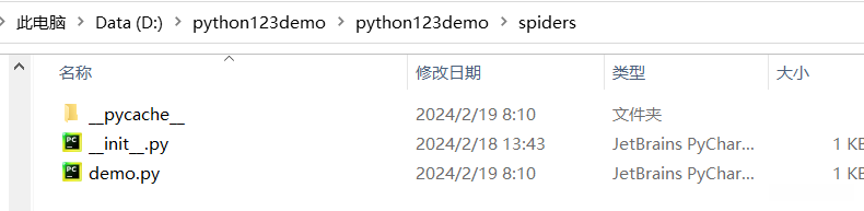 此时生成的工程目录如下:python123demo为外层目录。scrapy.cfg用于部属scrapy爬虫的部属文件,部属的概念是指将这样的爬虫放在特定的服务器上,并且在服务器配置好相关的接口,对于我们本机使用的爬虫来讲,我们不需要改变部属文件。与scrapy/cfg同目录的python123ddemo是指scrapy框架的用户自定义python代码。init.py是初始化脚本,用户不需要编写。items.py是items代码模板(继承类),这里也不需要用户编写。middlewares.py指的是middlewares代码模板(继承类),如果用户需要扩展middlewares,那么就需要把这些功能写到这个文件当中。Pipelines.py对应pipelines代码模板(继承类)。seettings.py是scrapy爬虫的配置文件,如果需要修改功能,就需要修改对应的配置项。spiders是spiders代码模板目录(继承类),这个目录下存放的是python123demo这个工程中所建立的爬虫,这些爬虫需要符合爬虫模板的约束。spiders下的_init_.py是初始文件,无需修改,若运行过的项目,spiders下会多一个_pycache_,为缓存目录,无需修改。