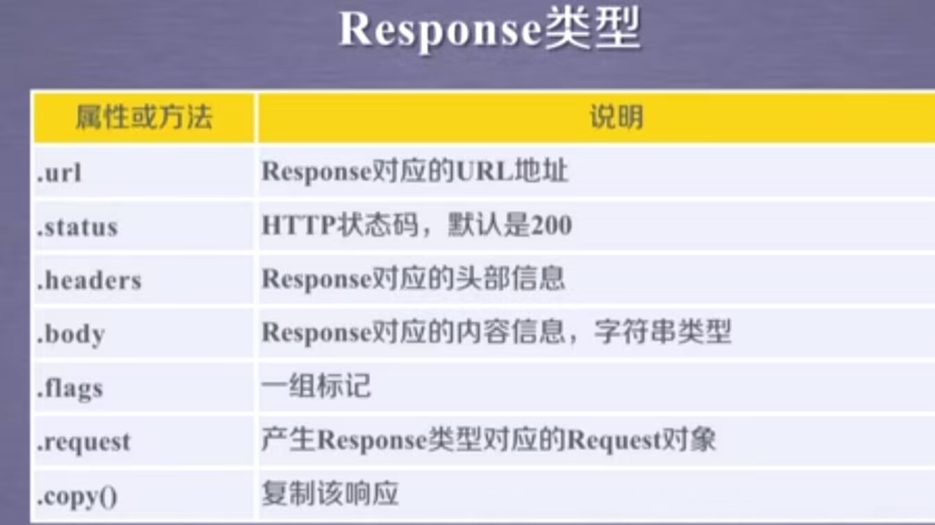 resopnse:class.scrapy.http.Response()。response对象表示一个http响应。由downloader生成,由spider处理。