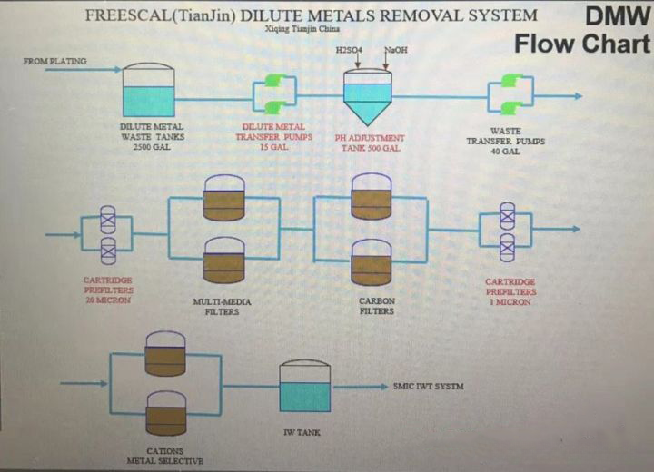 针对这类含有重金属的废水的处理工艺通常采用进水预处理的方式进行调节,并逐步实施酸碱平衡调节后加入适量的硫化钠使破碎结块得以溶解接着使用高浓度的硫酸亚铁作为絮凝剂促使悬浮物形成较大的絮凝颗粒进而通过过滤装置实现有效的分离随后将处理后的污水送入深度净化系统进一步脱盐除色并最终回收资源化利用这一系列流程可确保废水中游离态金属离子的有效沉淀去除从而实现对废水中游离态金属离子的有效沉淀去除