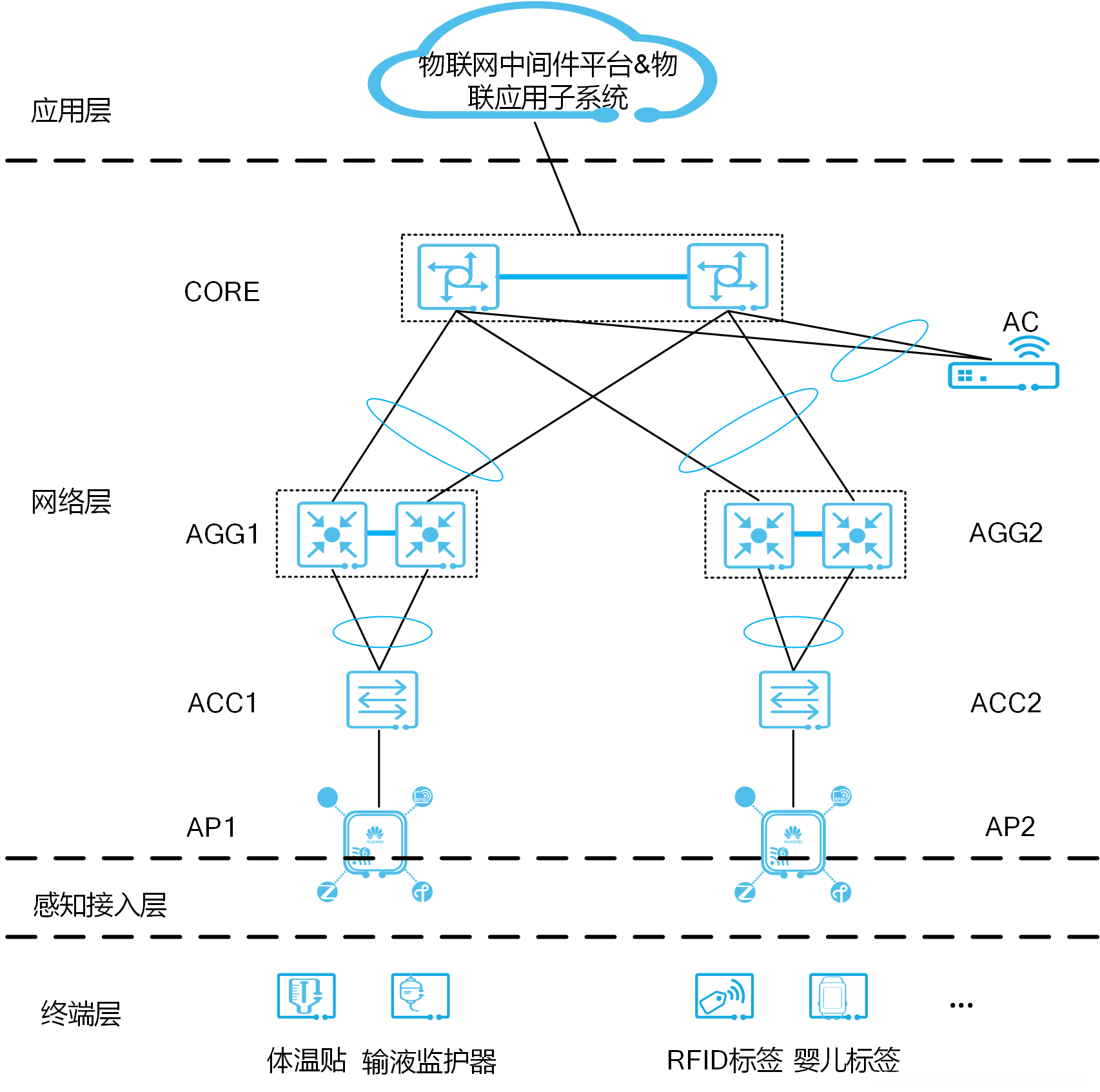 * 核心交换机:一般部署在中心机房,用于全院物联网流量的交换。推荐双机堆叠部署。