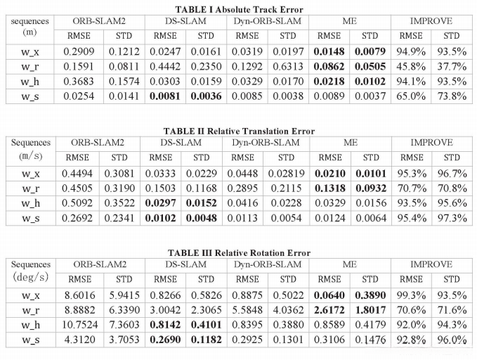 本研究采用EVO评估工具对四个动态数据集进行评估。在目标跟踪领域中,本研究中采用ORB-SLAM2、DS-SLAM、Dyn-ORB-SLAM以及自身提出的方法通过绝对航迹误差(ATE)和相对位姿误差(RPE)量化评估。其中DS-SLAM引用了本研究的数据结果作为参考依据;其余测试数据均在一台普通PC上运行获取。通过分析标准差与均方根误差等指标对比结果可知:表1展示了各算法在绝对轨迹上的差异;表2记录了相对平移量的变化情况;表3则呈现了各算法相对于旋转量的表现对比情况。