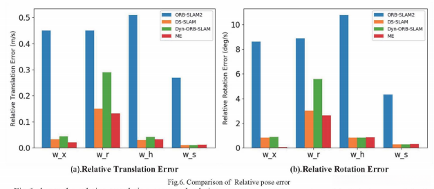 图6展示了本文算法与ORB-SLAM2及一些开源算法在高动态环境下的相对平移误差和相对旋转误差。从柱状图中可以看出, 本文算法明显优于ORB-SLAM2. 与之相比, 在与其他动态SLAM算法的比较中, 本文算法也具有一定的优势.