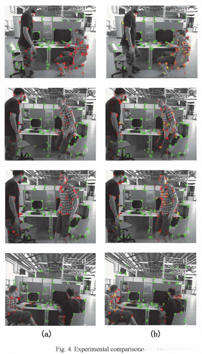 如图4所示,在第一列中描述了直接去除动态类别上所有特征点的方法,在第二列中展示了本文提出的方法。其中,“绿色”的标记代表的是静态特征信息,在这种情况下可以直接应用;而红色标记则代表的是动态特征信息,并具有不稳定性;黄色标记则表示那些原本属于动态类别的特征信息,在经过本文算法处理后被归类为静态类别;最后将绿色标记与黄色标记结合起来就构成了完整的静态数据集