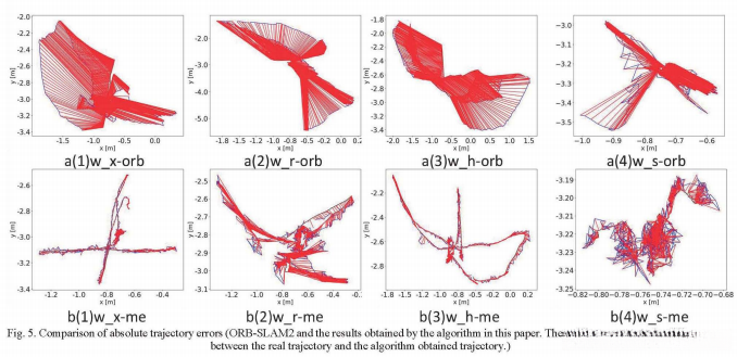 图5展示了该算法与 orb-SLAM 2 算法在各类动态环境下的运行轨迹。道路边缘的红线标记了实际运动轨迹与算法输出路径之间的偏差。通过观察图形信息, 我们能够更清晰地理解这一现象的本质。基于 orb-SLAM 2 算法对本系统进行了优化改进, 在复杂多变的动力学环境中表现更为稳定可靠