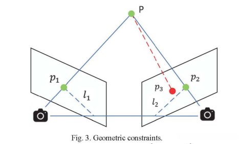 初始位姿估计过程仅利用静态区域中的特征点来进行计算,在此过程中我们能够获得静态区域内的一些可靠匹配点,并通过这些匹配点推导出两帧之间的基本矩阵。本文通过极线约束来检测潜在动态区域内特征点的动态概率。