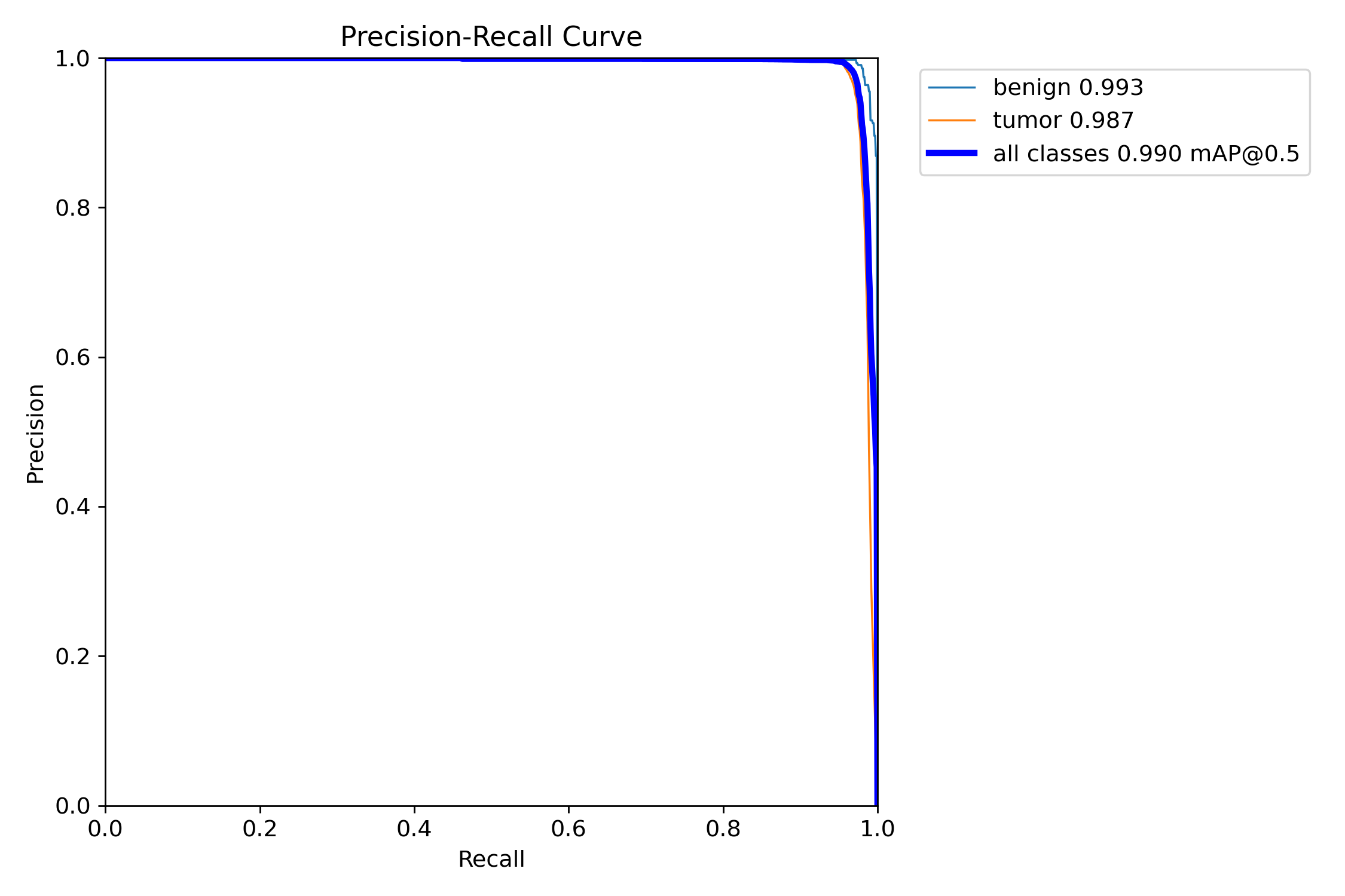 模型的各项性能数据 mAP 、Precision 和 Recall 分别以蓝色、绿色和红色标记。各项数据均表现优异,并展现出该模型整体上表现出色的特点。