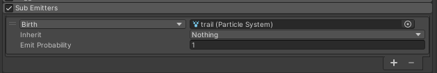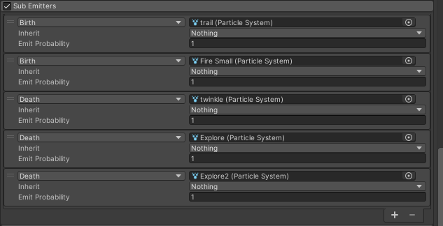 请设置子粒子系统:类似于Explore2的操作流程,在此界面中找到并勾选 Sub Emitters 选项。接下来,请将Firework的所有子粒子系统包含进去,并按照以下步骤进行配置。