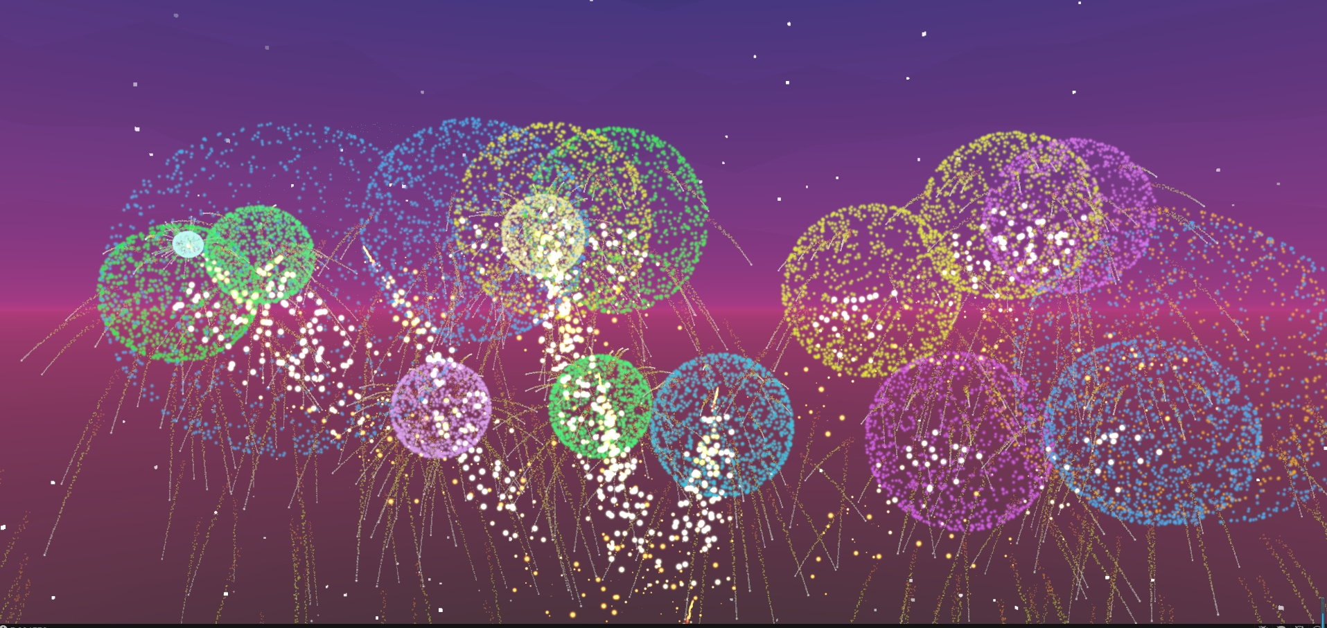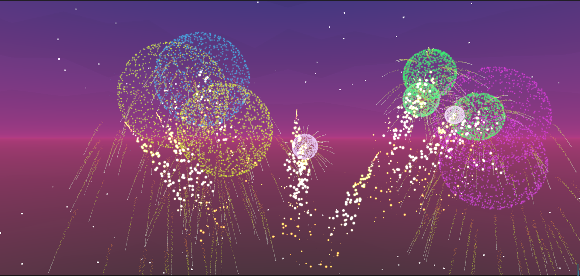 在场景中布置了四个不同颜色的 Firework。每个 Firework 都具有独特的烟花色彩。每次发射时会从四个预设的发射装置中选择启动其中一个,并可设置其飞行持续时间和速度参数。以确保所有焰火按照预设路径准确触发爆炸。
