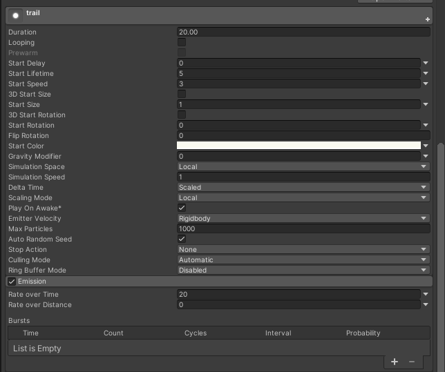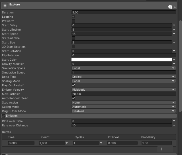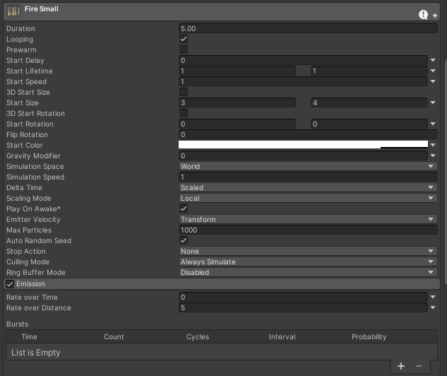在Fire small中的Emission方面,在采用Rate_{over~Distance}之前,并未采用 Rate_{over~time} 或 Burst 这两种方法。 Rate_{over~Distance} 指的是每单位移动距离所发射出的数量。换句话说,在这种情况下我们的 Fire small 仅会在运动过程中才会释放出粒子